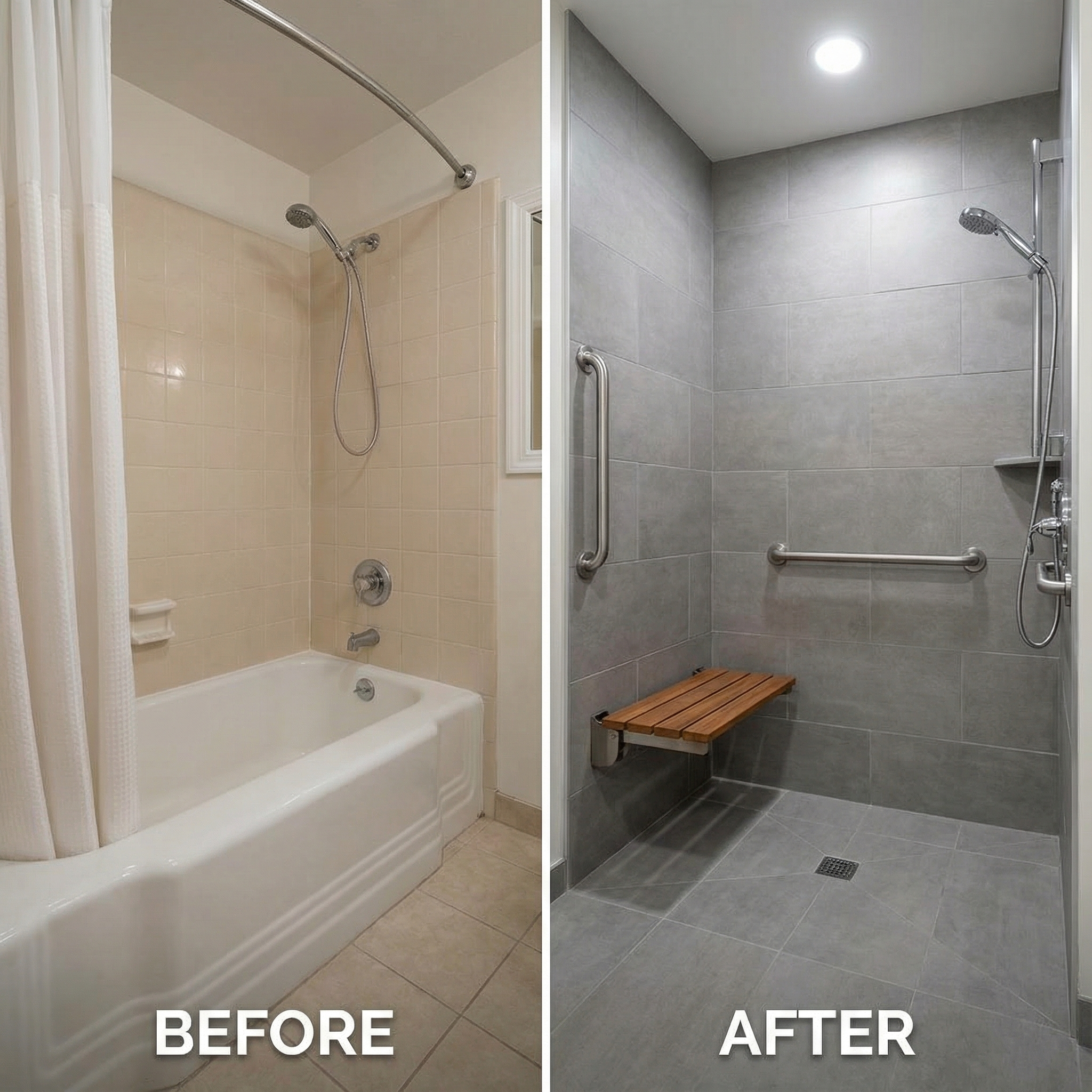 Simple grab bar installations can be one same-day. Tub-to-shower conversions typically take 1-2 days. Full bathroom remodels take 3-7 days depending on scope. We'll give you an exact timeline in your quote.